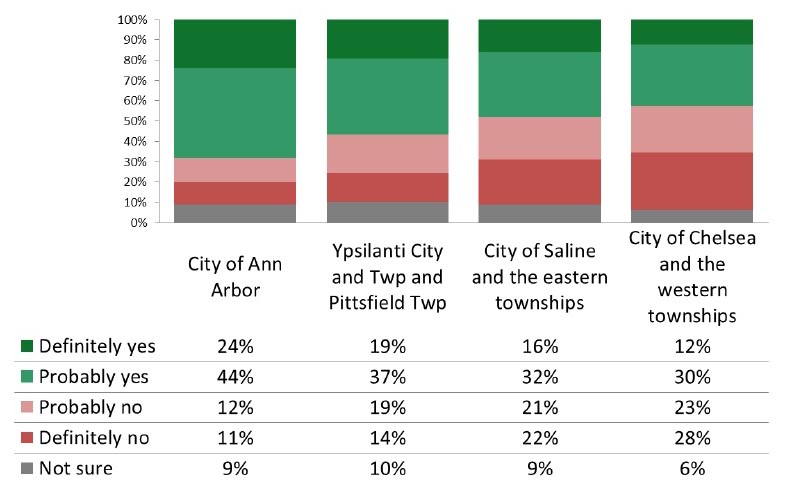 The survey was taken in four geographic regions (the full report that discusses actual distribution of samples has not yet been released), and the results differed by region. While 68% of Ann Arbor residents said that they definitely or probably would vote for a millage, 56% of Ypsilanti and Pittsfield residents, 48% of Saline and eastern townships, and only 42% of the western townships, including the city of Chelsea, gave this positive answer. (Click to see a full-size chart.)